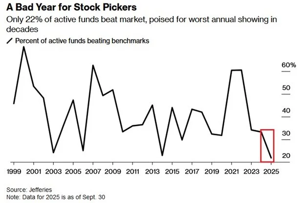 To reiterate the above chart, just 22% of the actively managed stock picking mutual funds are beating their index benchmarks despite a massive deployment of resources to try and do just that.